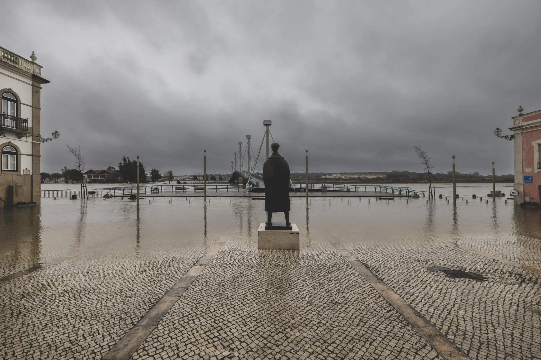 Then I came into that open area where the statue of Pedro Nunes stands, overlooking the river and the walkway bridge. The water was already up to the stone beneath his feet. The river was flowing faster than normal.